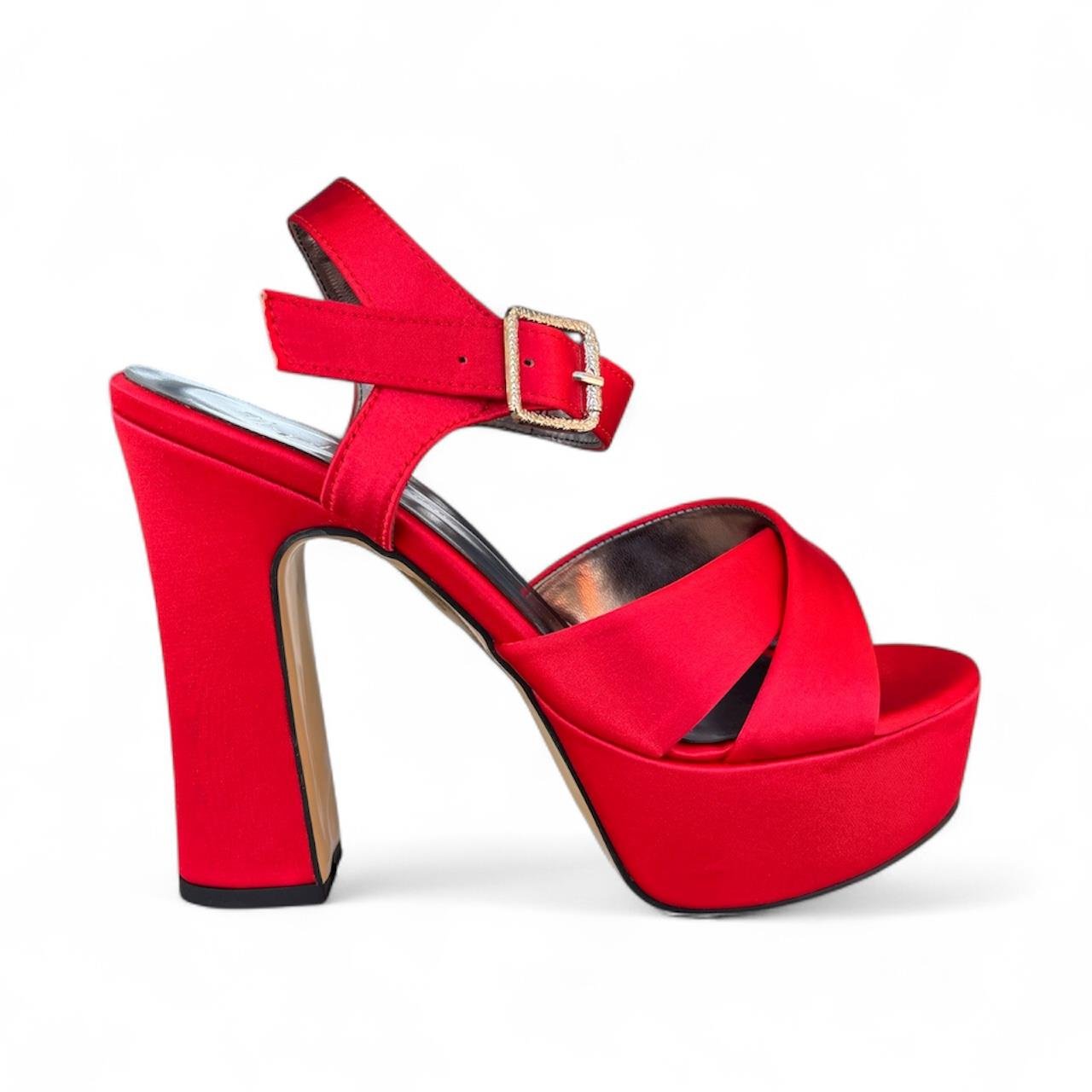 Kadın Çapraz Bantlı Kalın Topuklu Açık Ayakkabı Kırmızı Saten (20-2055-)