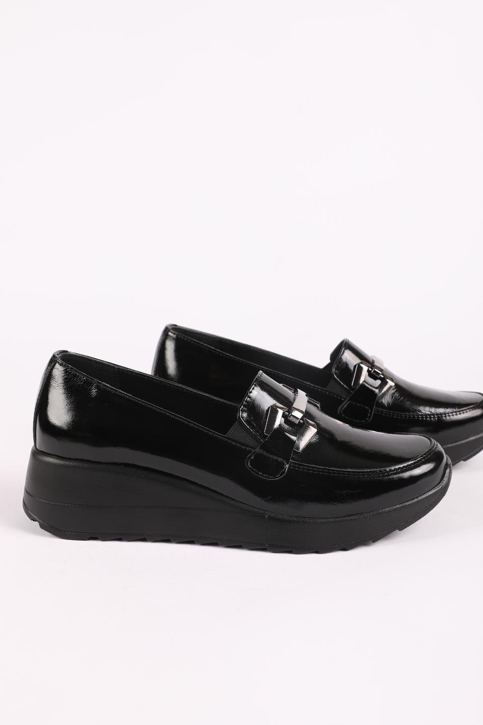 Kadın Hakiki Deri Toka Detaylı Comfort Ayakkabı Siyah Rugan (20-2983-)