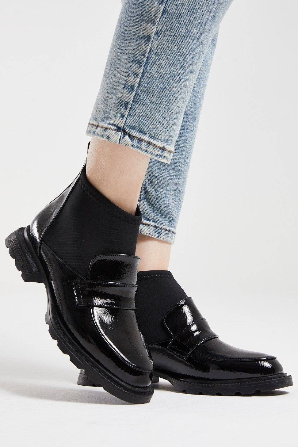 Kadın Yanları Streç Loafer Bot Siyah Kırışık Rugan (30-2545-)