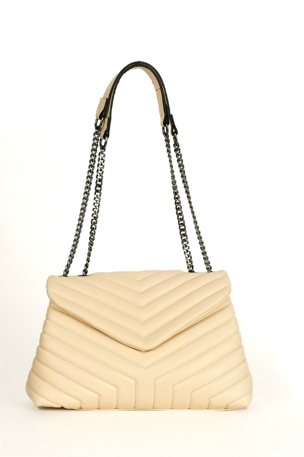 2 bölümü vardır.Ortada 1 küçük fermuarlı kısım ve 2 küçük fermuarlı bömesi mevcuttur. En: 33 cm, Boy: 21 cm.